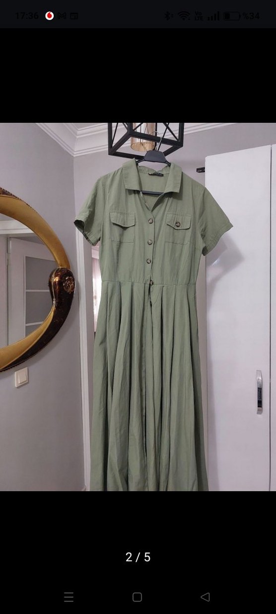 Keten kumaştan, düğmeli, kısa kollu ve yakası kesik yakalı uzun, bol kesim khaki elbise. Rahat ve gündelik kullanım için uygundur.