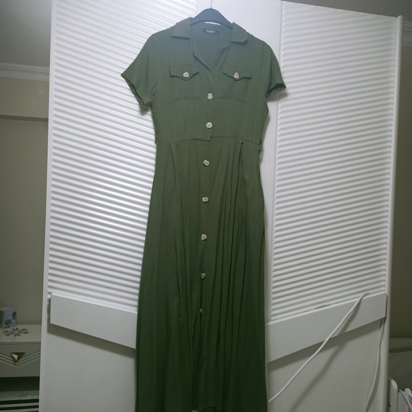 Keten kumaştan, düğmeli, kısa kollu, yakalı, bol kesim ve haki renk uzun elbise, günlük rahat stil için uygundur.