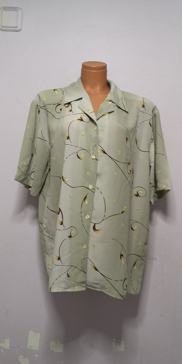 Kısa kollu, düğmeli ve bol kesim kadın gömleği. İpek gibi kumaştan, tek renkli pastel bej ve vintage desenli, ofis kullanımı için uygun. Xl beden boyu 71cm iki kol arası 60cm