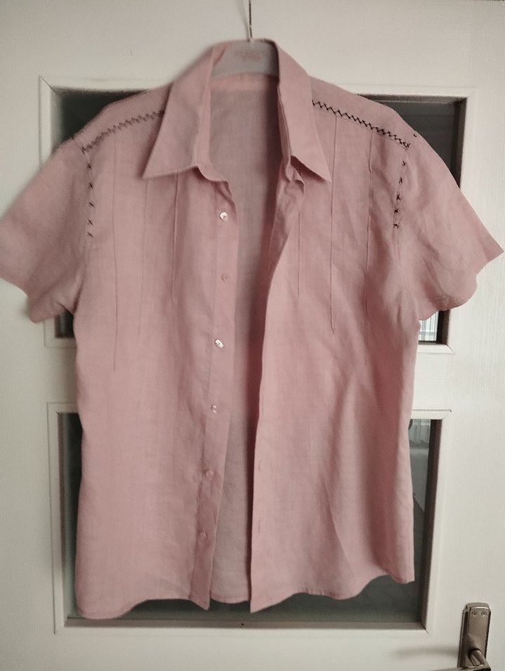 Pastel pembe vintage tarzı kadın keten gömlek, kısa kollu, yakası kesik ve düğmeli. Orta boy, normal kesim ve omuzlarda ince dikiş detayları bulunur. ölçü 54/71