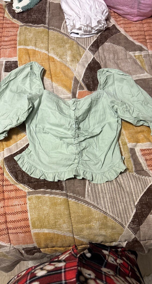 Yumuşak keten kumaştan yapılmış, düğmeli ve kısa kollu bu yeşil bluz, tek renk ve bohem vintage tarzını yansıtıyor.
