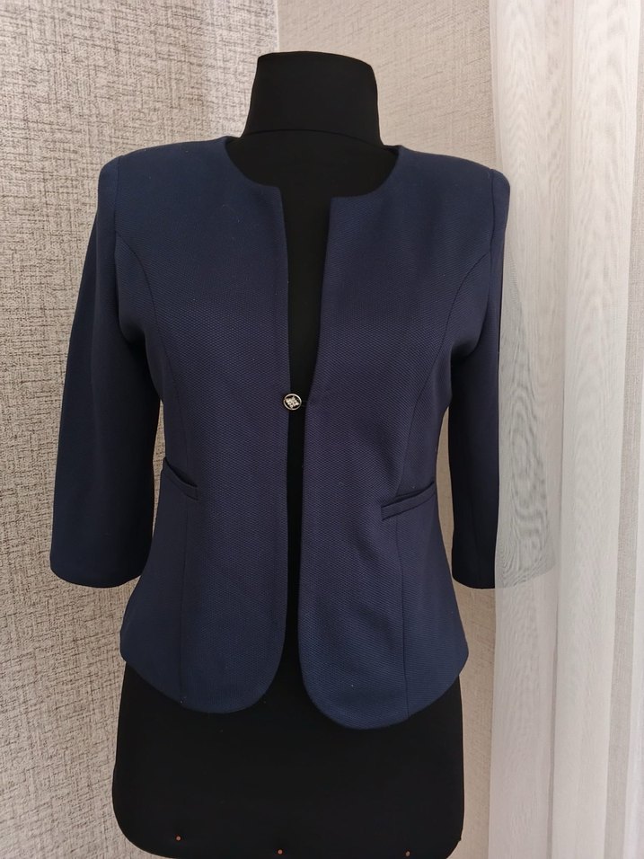 Düğmeli, kısa kesim, uzun kollu ve regular fit lacivert blazer ceket. Sentetik kumaştan üretilmiş, ofis kullanımı için uygundur.