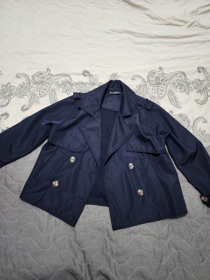 Düğmeli ve kesik yakalı bu kısa lacivert ceket, uzun kollu ve bol kesimdir. Sentetik kumaştan üretilmiş, günlük sokak stili için uygundur.