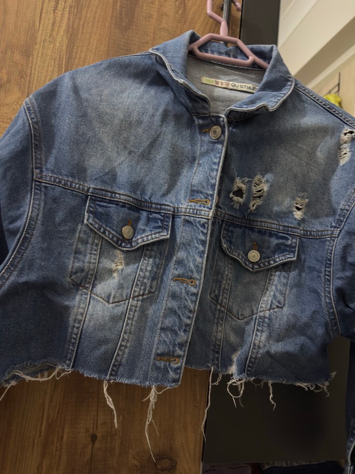Düğmeli, kısa kesim, bol kesim mavi denim ceket. Yaka detaylı,l ve yıpranmış görünümde, günlük rahat stil için uygun. Etikette kucuk beden yaziyor ama ben 42 bedenle giydim. Oversize bir yapisi vardir. Hicbir sorunu yoktur