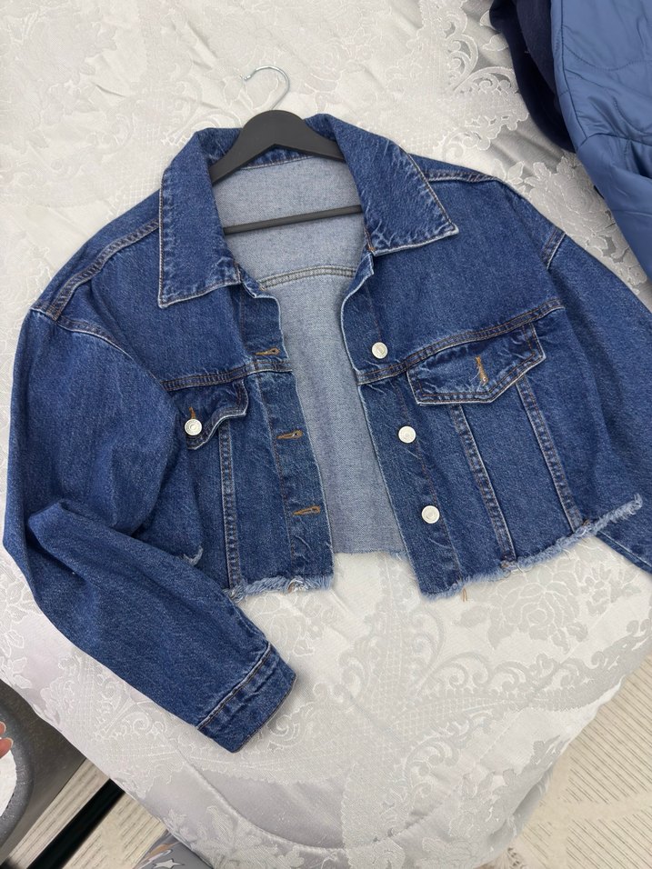 Mavi denim kumaştan, düğmeli kısa boy ve bol kesim ceket. Notlu yakası ve uzun kolları ile rahat, günlük sokak tarzına uygun bir parça.