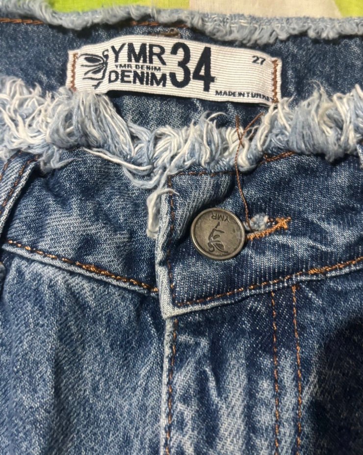 Düğmeli, baskılı desenli, kısa kesim mavi denim kadın jean. Sokak stiline uygun, günlük kullanıma ideal.