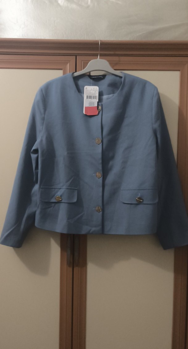 Düğmeli, kısa kesim, mavi kadın blazer. Uzun kollu, yakası kesimli, sentetik kumaştan üretilmiştir. Ofis ve günlük sokak stiline uygundur.