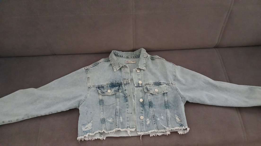 Düğmeli, kısa kollu, bol kesim mavi denim ceket. Yıpranmış görünüm ve püsküllü etek ucu ile gündelik rahat kullanım için uygundur. Boy 47 Omuz 55 En 55v Kol 55 Xl