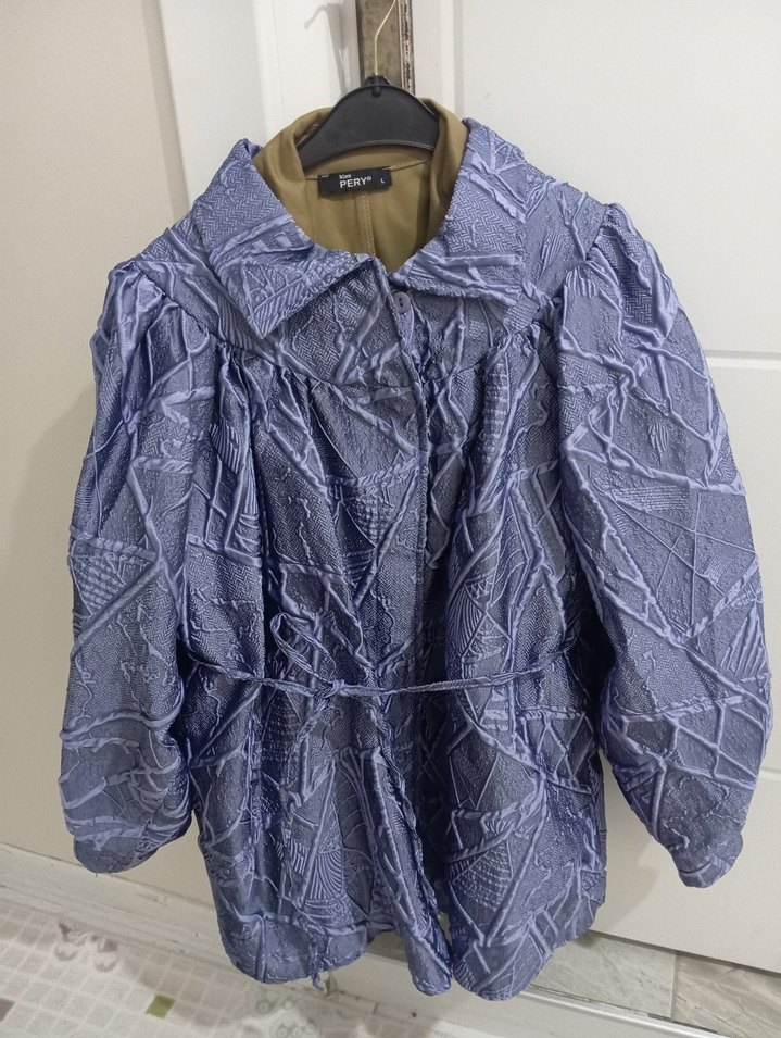 Mavi keten kumaştan, düğmeli, yakası kesik uzun kollu, bol kesim kısa uzunlukta kadın ceket. Paris sokak modasına uygun, şık ve rahat.