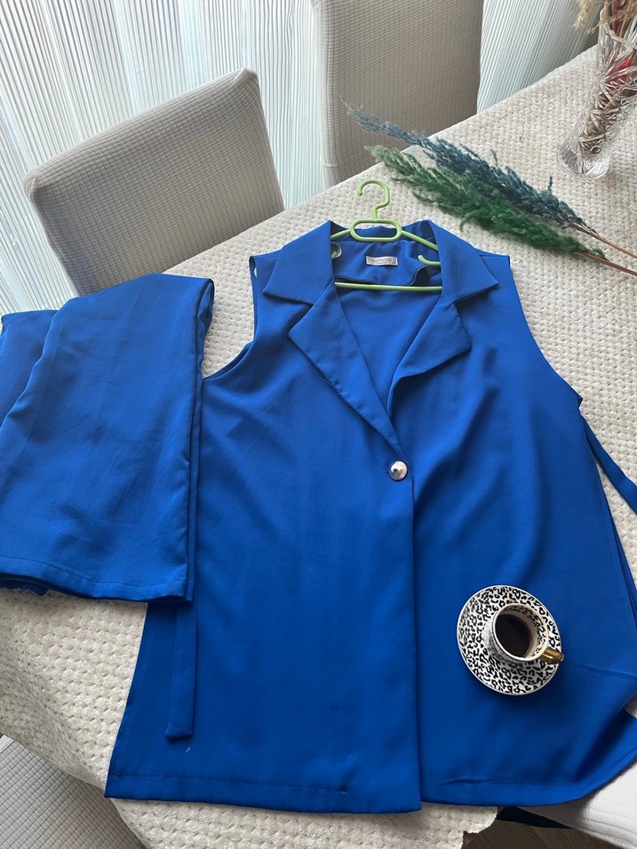 Düğmeli, kolsuz kısa mavi kadın takımı, parlak sentetik kumaştan üretilmiş, notlu yaka ve rahat kesime sahiptir. Günlük kullanıma uygundur.