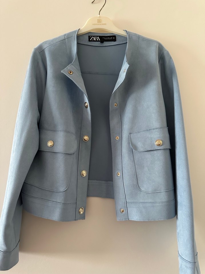 Düğmeli, kısa kesim mavi süet kadın ceket, uzun kollu ve keskin yakalıdır. Günlük şık sokak stiline uygundur.