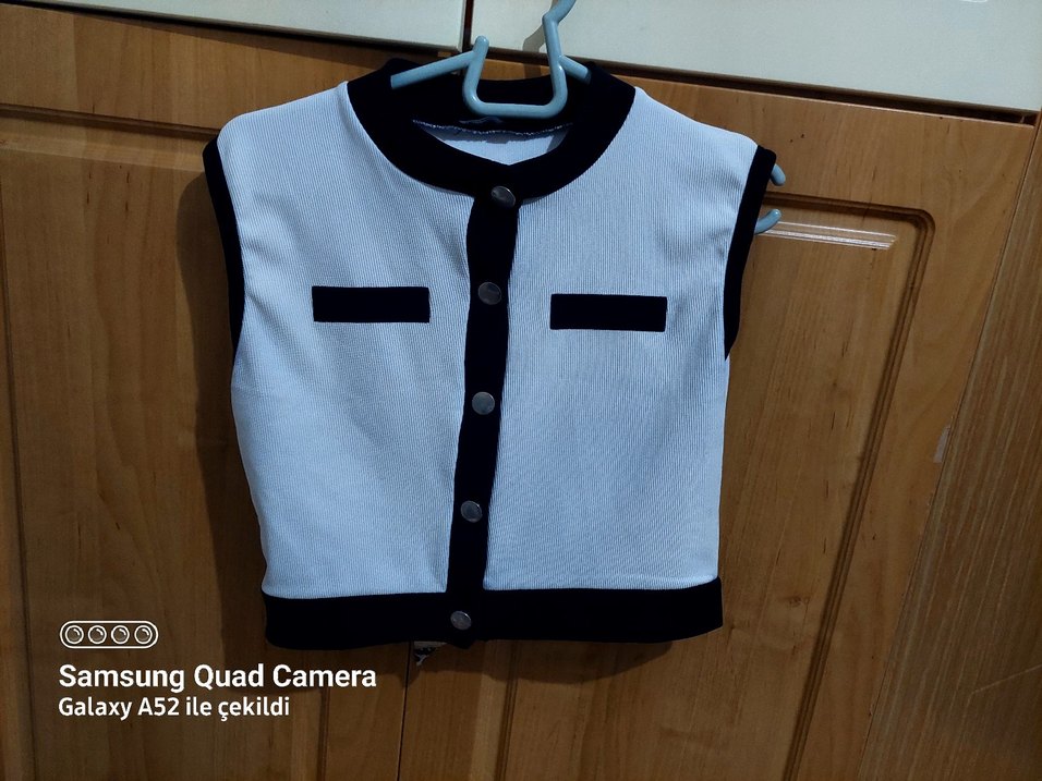 Düğmeli, kolsuz ve bisiklet yaka kısa kesim pamuklu yelek. Beyaz renkli, koyu detaylar ile sokak tarzına uygun rahat bir parça.
