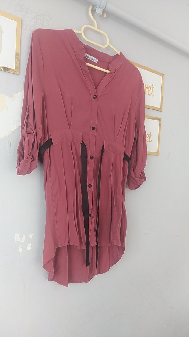 Koyu pembe renkli, düğmeli ve V yakalı bluz. İpek gibi kumaştan, askılı kollu ve kısa boyda, günlük sokak tarzı için uygundur.