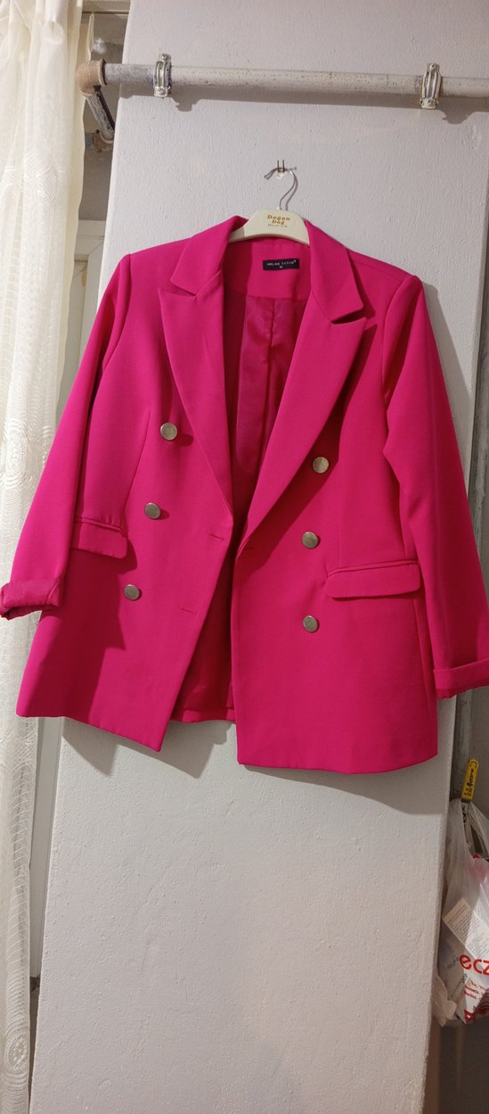 Renkli pembe kadın blazer, kesikli yaka ve düğmeli ön tasarıma sahiptir. Regular fit ve kısa boyuyla Paris sokak tarzına uygun, ofis için ideal, sentetik kumaştan üretilmiştir.