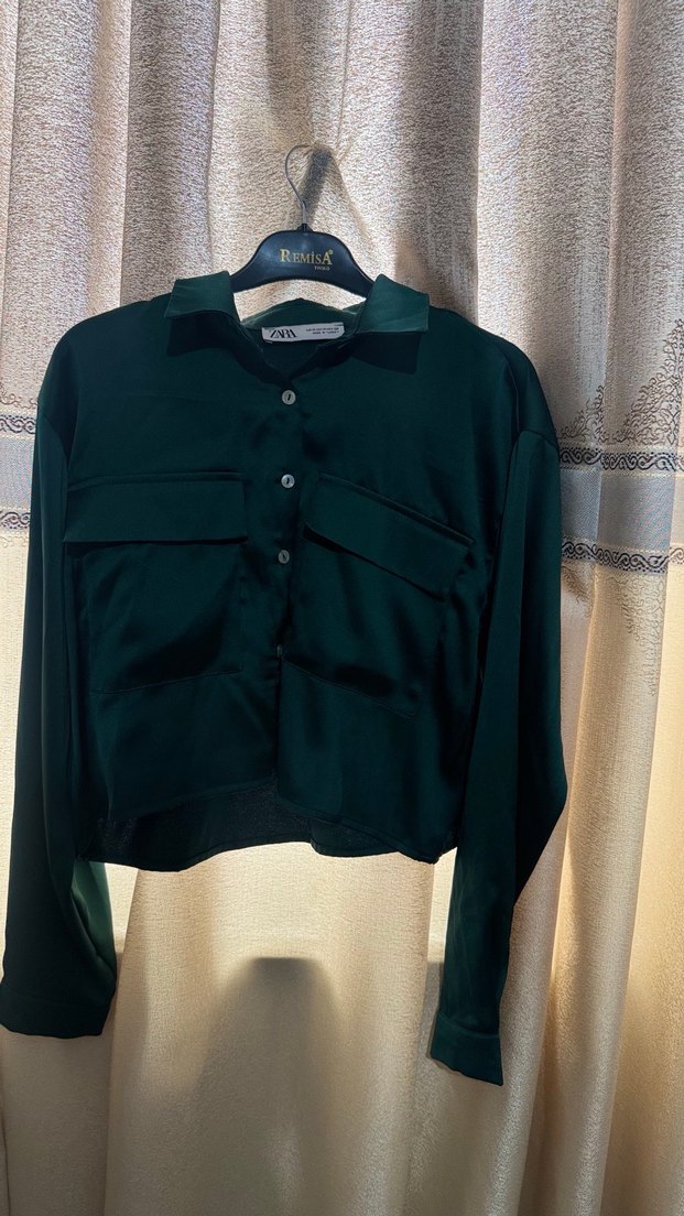 Düğmeli, yakalı ve uzun kollu bu kadın gömleği, kısa ve bol kesimdir. Pürüzsüz sentetik kumaştan yapılmış, koyu yeşil renkli günlük sokak stili için uygundur.