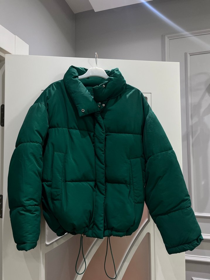 Düğmeli, yüksek yakalı koyu yeşil kadın kışlık mont. Kısa ve bol kesimli, uzun kollu, yumuşak ve sıcak kumaştan rahat günlük kullanım için uygundur.