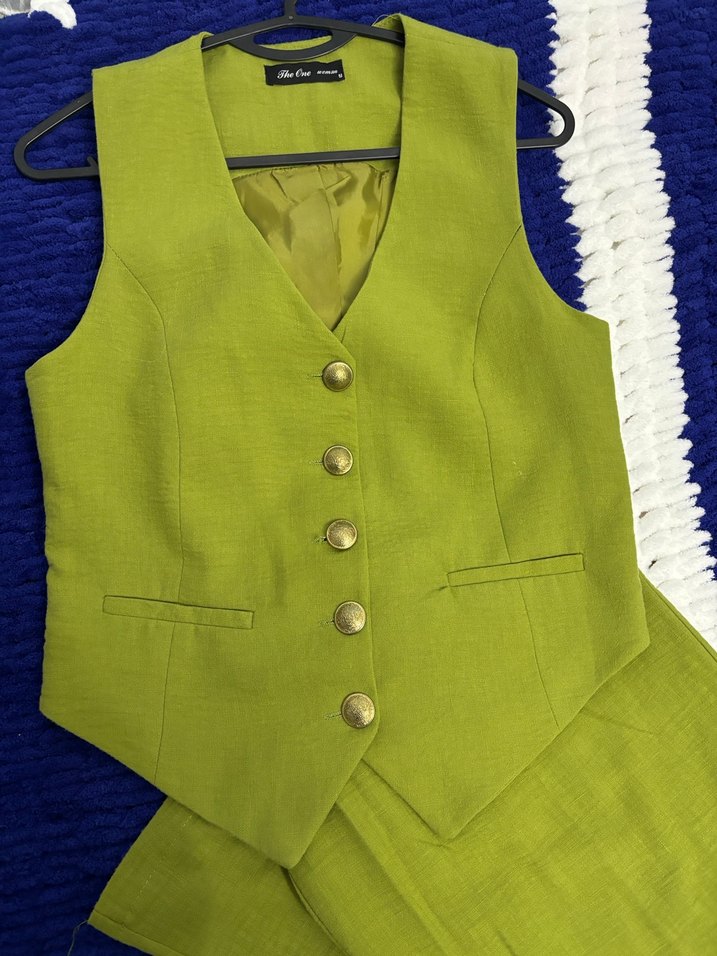 Düğmeli Kısa Yeşil Keten Kadın Yelekli takım