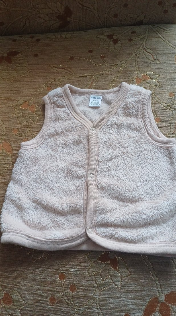 Düğmeli ön kısmı ve salaş kesimi olan kolsuz kız bebek yeleği. Yumuşak ve sıcak kumaştan, askısız yakaya sahip sade pastel beyaz renkte.