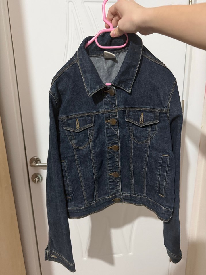 Düğmeli, uzun kollu, kesimli mavi denim ceket. Sokak stiline uygun, günlük kullanıma ideal.