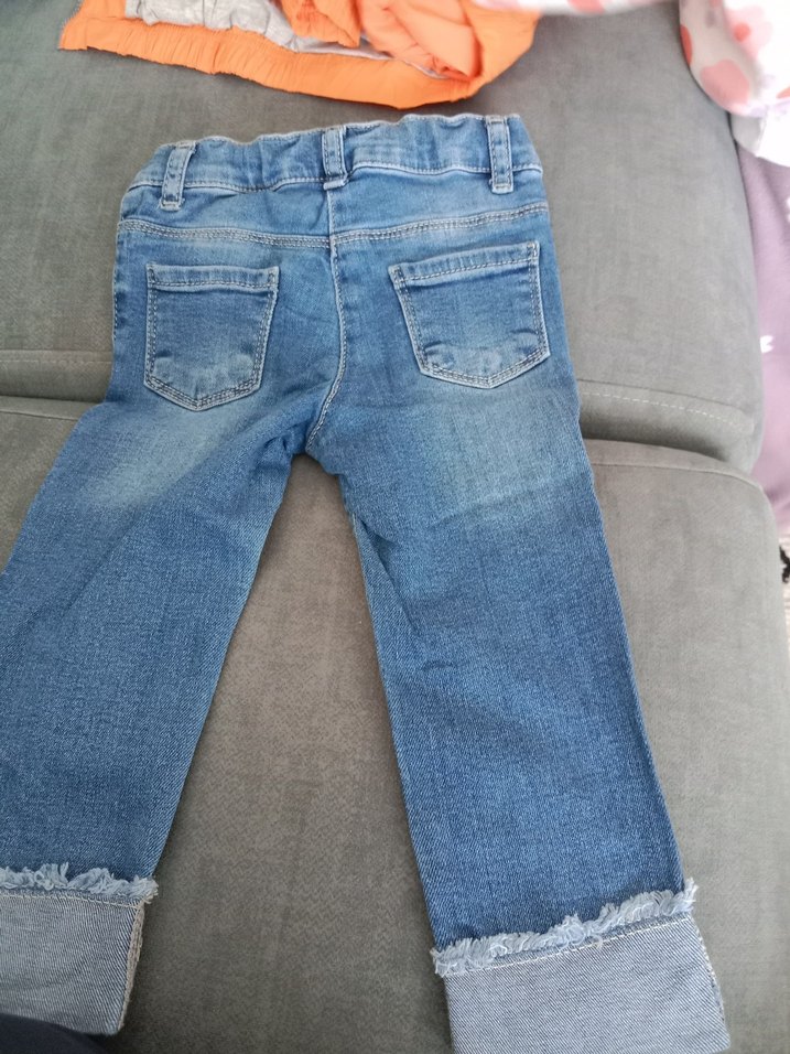 Düğmeli, düz mavi-gri renkli, normal kesim kız çocuk kot pantolon. Katlanmış paça ve arka cepler bulunur.