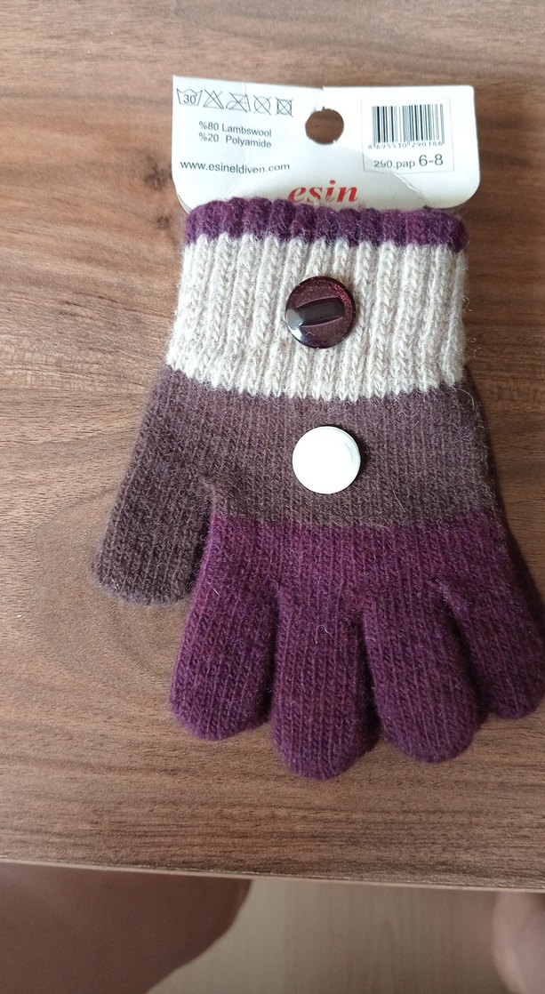 Düğmeli, mor renk örgü kız çocuk eldiveni. Yumuşak yün karışımı kumaştan üretilmiştir, sıcak ve rahat tutar.