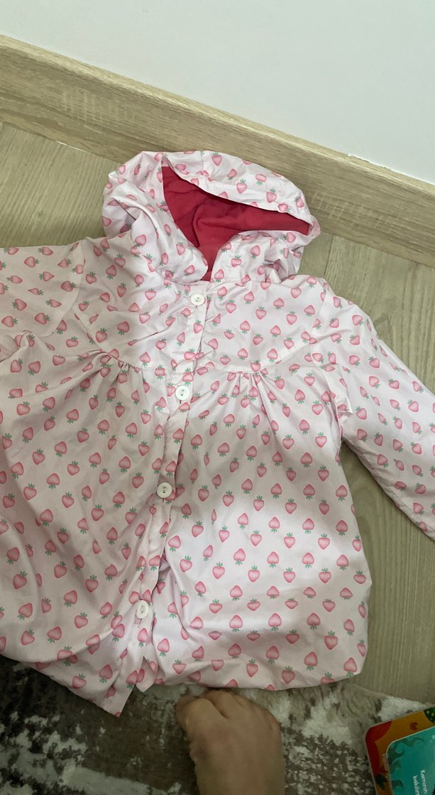Düğmeli önü ve kapüşonu olan kız çocuk yağmurluğu, yumuşak sentetik kumaştan yapılmış, pastel pembe ve küçük kalp desenlidir. Rahat kalıp, günlük kullanıma uygundur. ☔