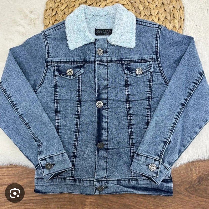 Düğmeli, gri peluş yakalı kız denim ceketi. Regular fit ve düz mavi renkte, sokak tarzı için uygun. Metal düğmeli cepleri bulunur.