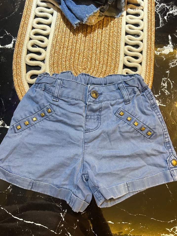 Düğmeli ve perçin detaylı cepleri olan mavi kot kız şortu, sokak tarzı için uygun, vücuda oturan kesimde.