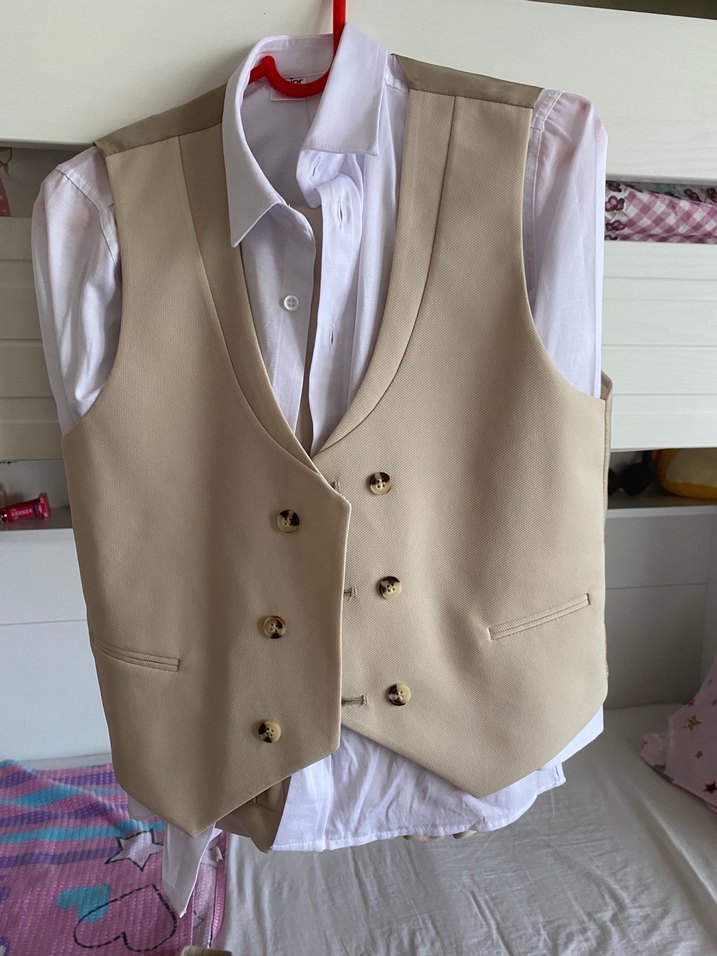 Düğmeli, bej renkli, notched lapel yaka sleeveless yelek. Normal boy, regular fit, hafif sentetik kumaştan üretilmiştir. Ofis için uygun klasik sokak stili.