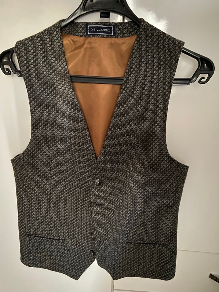 Düğmeli, klasik kesim gri erkek yelek. Kolsuz, normal boyda, sentetik kumaştan, ofis kullanımı için uygundur. Kumaşı kalın mevsimlik S-M bedene uyumlu sadece bir kez giyildi temiz kaliteli çok güzel bir ürün