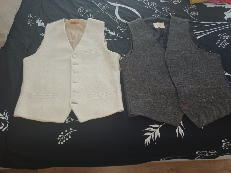 Gri ve beyaz renklerde, düğmeli, yakalı, kolsuz yelekler. Normal kesim ve midi boyda, sentetik kumaştan. Ofis kullanımı için uygun. krem olan diğerine oranla biraz daha dardır ikiside slim fittir gri olan da iç bölme de hafif bir sökük vardır dikilebilir