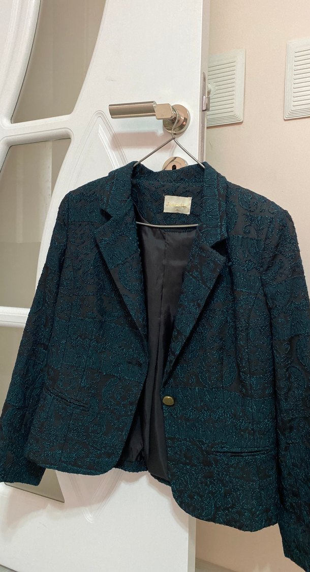 Düğmeli, uzun kollu kadın blazer ceket. Klasik yeşil, desenli dokuma kumaştan, normal midi boyda ve rahat kesimli. Ofis için bohem Paris tarzında şık bir seçenek. S-M bedene uyumlu vintage ceket