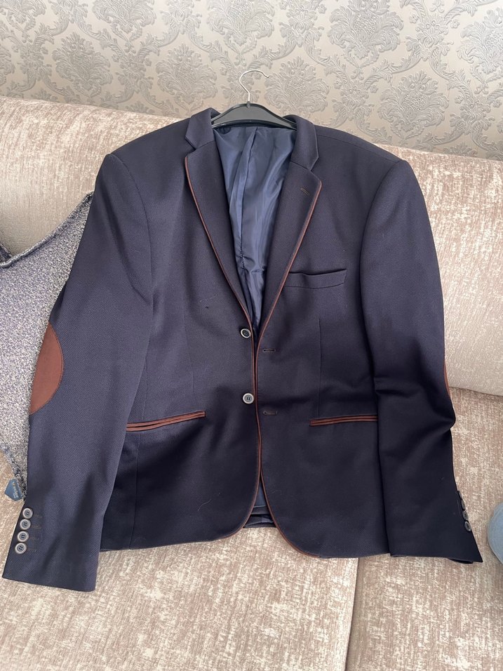 Düğmeli, klasik kesim erkek ceket, modern klasik tarzda. Normal uzunlukta, uzun kollu, laviver üzerine kahverengi şerit detaylıdır. Ofis için uygundur. Koş kısmında kadife yama modeli vardır