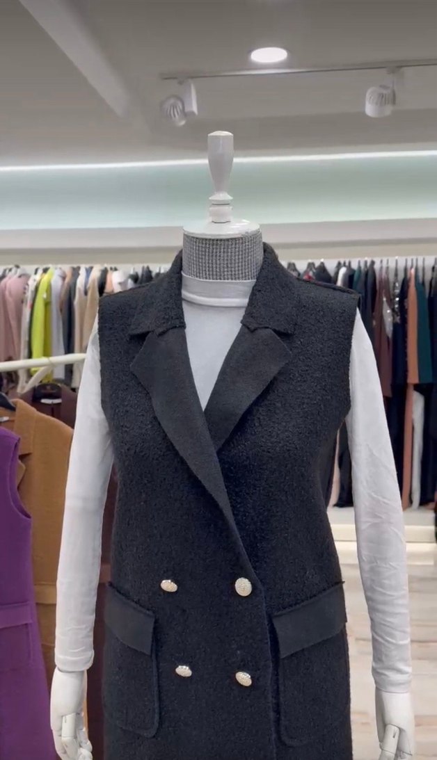 Düğmeli çift düğmeli önü ve klasik yaka detaylı, sentetik kumaştan kadın yelek. Modern klasik tarz, günlük iş kullanımı için uygun.