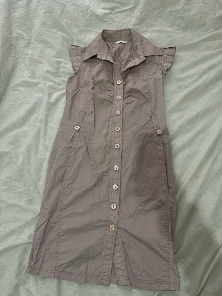 Kolsuz, yakalı, düğmeli bej keten midi elbise. Fitted kesim, günlük sokak stili için uygundur.