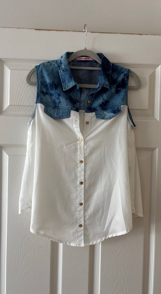 Kolsuz, yakalı gömlek, üst kısmı batik denim ve altı beyaz kumaştan oluşur. Düğmeli ve bol kesim, günlük sokak stili için uygundur.