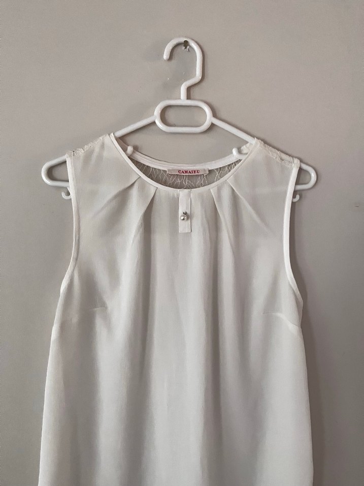Kolsuz, düğmeli beyaz bluz. Yuvarlak yakalı, bol kesim ve normal midi boyda. Günlük kullanım için sade ve desensiz tasarım. Standart beden.