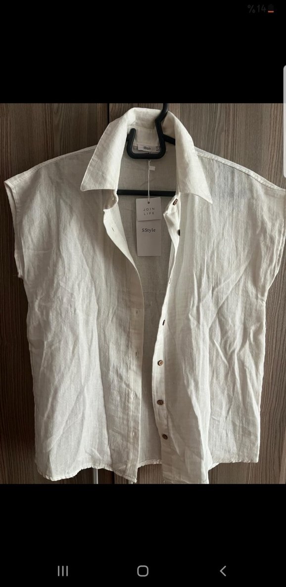 Kolsuz, düğmeli önü ve yakalı beyaz keten gömlek, rahat kesim. Günlük kullanım için uygundur. Hiç Kullanılmamıştır.