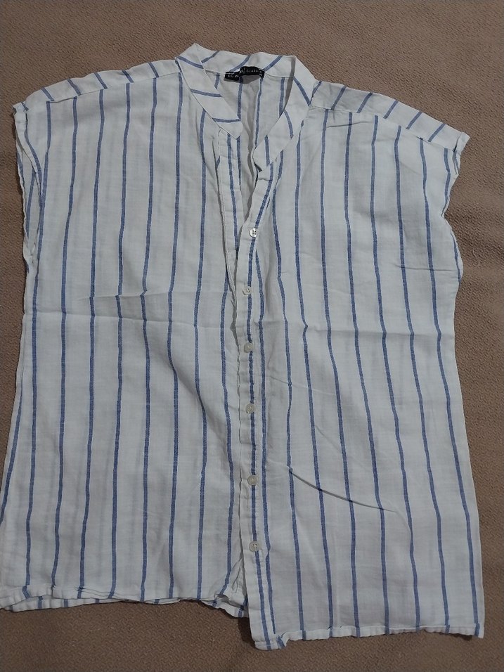 çizgili beyaz kolsuz gömlek, düğmeli ön, bol kesim ve yakalı. Yumuşak keten kumaştan, midi boy, günlük sokak stili için uygun.