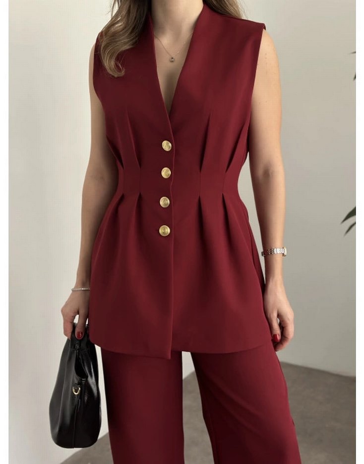 Düğmeli ön detaylı, kolsuz bordo mini takım. Parlak yüzeyi ve klasik modern tarzıyla ofis için uygundur.