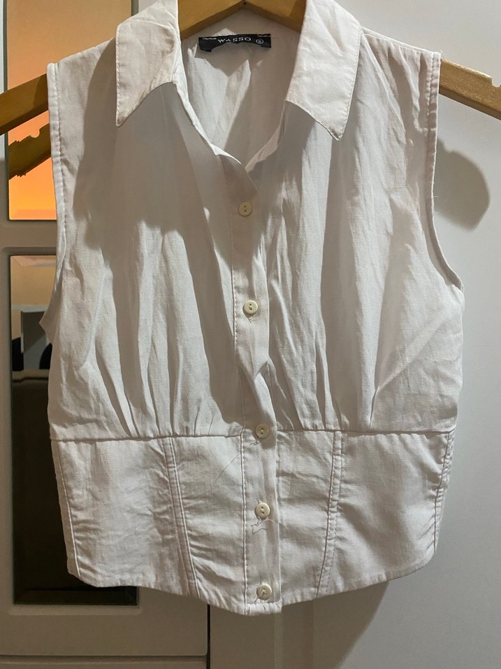 Düğmeli, kolsuz beyaz crop gömlek, yakalı ve midi boyda. Ofis için uygun, Paris sokak stili etkisi taşıyan fitted kesim. Vücuda yapışıyor ve bele tam oturuyor. Alındığından beri neredeyse hiç giymedim çünkü giyecek yer bulamadım. Ofis için uygundur. Hiçbir kusuru bulunmamakta.