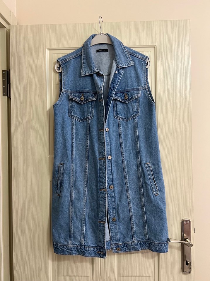 Düğmeli, kolsuz midi uzunlukta, bol kesim denim ceket. 1 2 kez giyildi