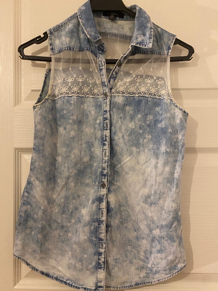 Düğmeli, kolsuz ve fitted kesim denim gömlek. Bağlama desenli ve şeffaf çiçekli dantel detaylı, günlük sokak stili için uygun.