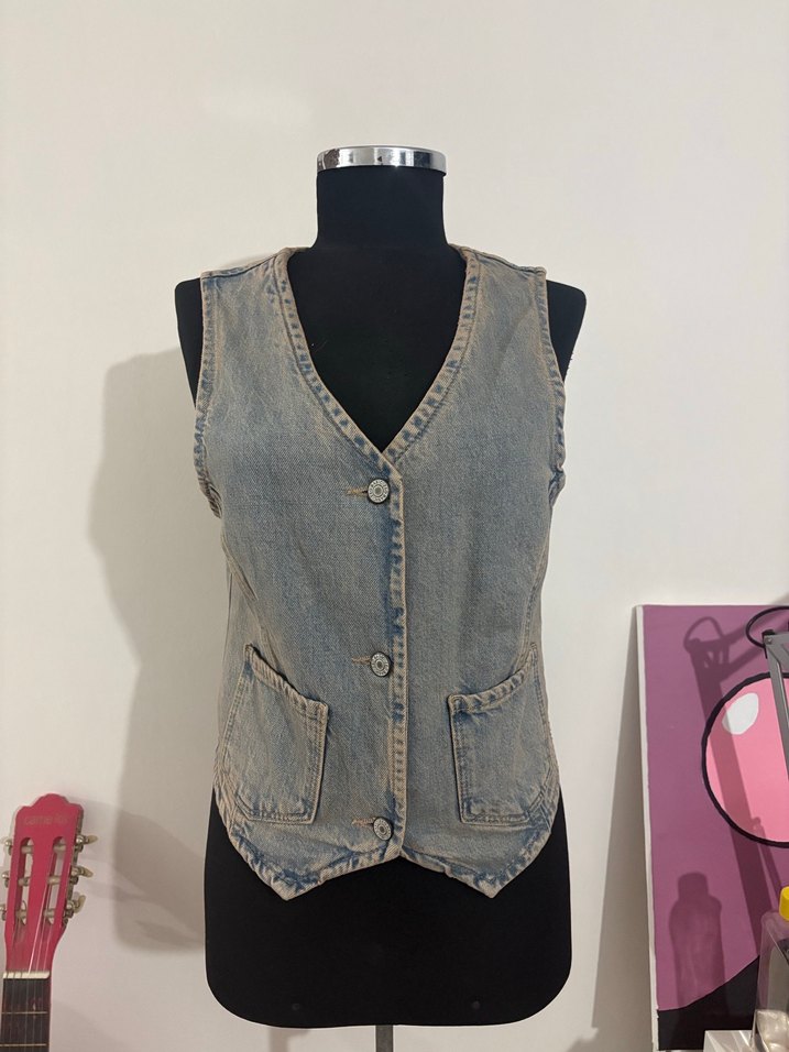 Düğmeli, kolsuz denim yelek, notched lapel yakalı, normal boyda ve rahat kesimlidir.Y2k
