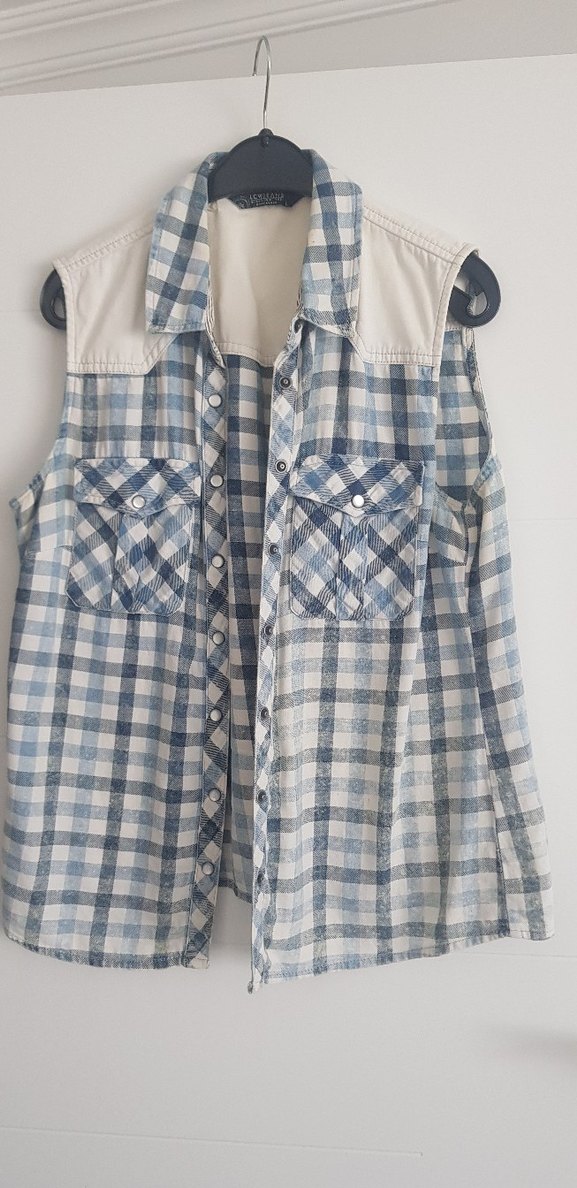 Düğmeli, kolsuz denim gömlek, yakalı ve bol kesim. Mavi-gri ekose desenli, cep detaylı. Günlük rahat sokak stili için uygun.