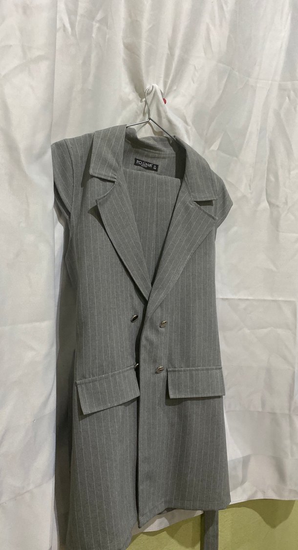 Düğmeli Kolsuz Gri Kadın Takım Elbise