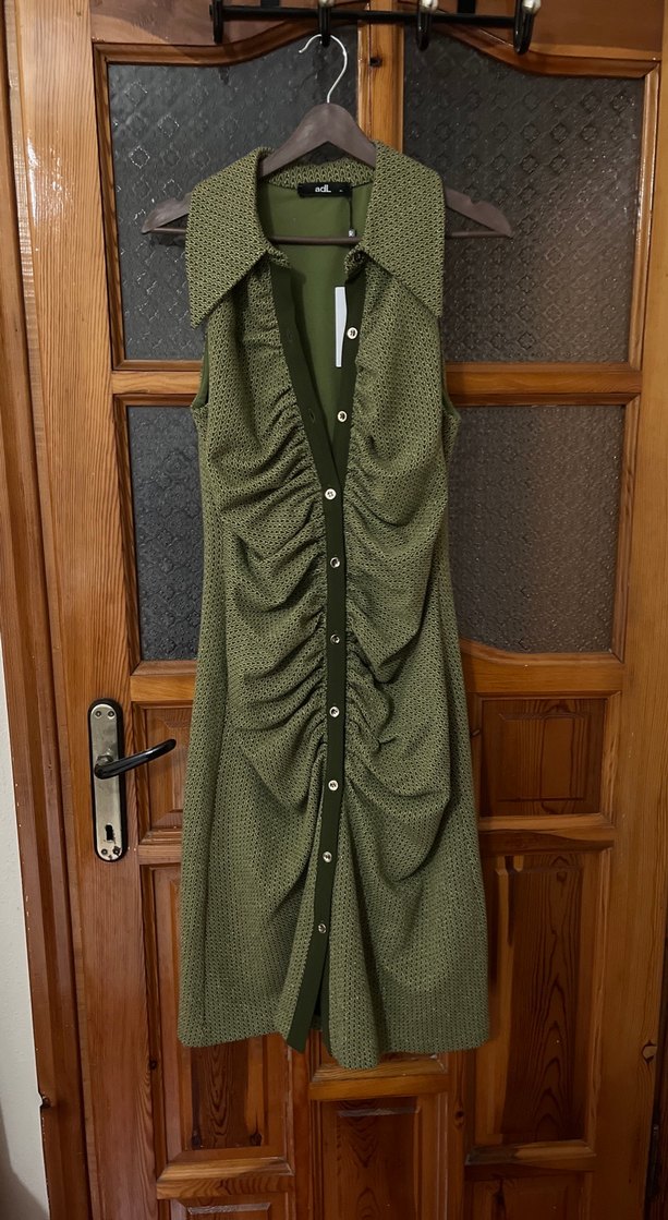 Düğmeli, kolsuz, haki renkli, desenli uzun elbise. Sentetik kumaştan, fitted kesim ve yakası notched lapel şeklinde. Bohem tarzda, günlük kullanım için uygun. Boyu 111cm iki kol arası 45cm esnek