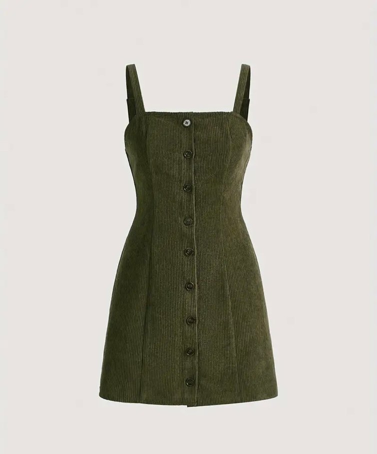 Düğmeli Kolsuz Haki Süet Midi Elbise