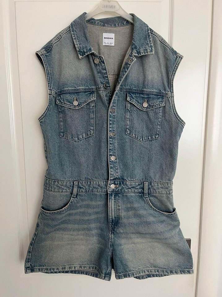 Bershka Düğmeli, kolsuz jean tulum, bol kesim ve normal boy şortlu. İki göğüs cebi ve yaka detaylı, günlük sokak stiline uygun.