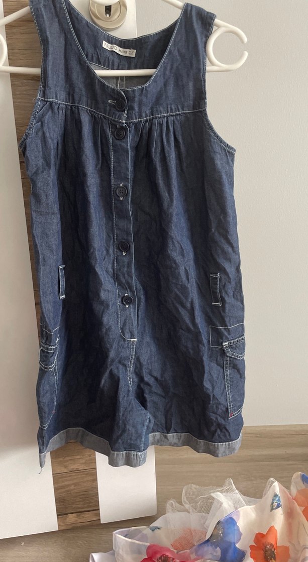 Düğmeli, kolsuz, bol kesim ve midi boy lacivert denim tulum. Günlük rahat kullanıma uygun, straplez yakalı.
